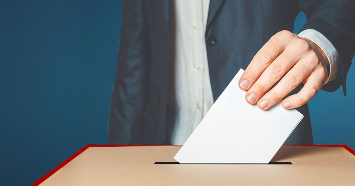 Person in suit casting vote into ballot box